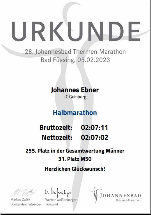 Hervorragende Ergebnisse beim Thermenlauf in Bad Füssing: *Halbmarathon - W30 3. Platz - Zeilberger Stephanie (1:47:11.14) * Halbmarathon - M50 19. Kraxenberger Anton (01:50:50) * Halbmarathon - M50 31. Ebner Johannes (02:07:11) **Marathon - M50 11. Schießl Norbert (03:33:05)