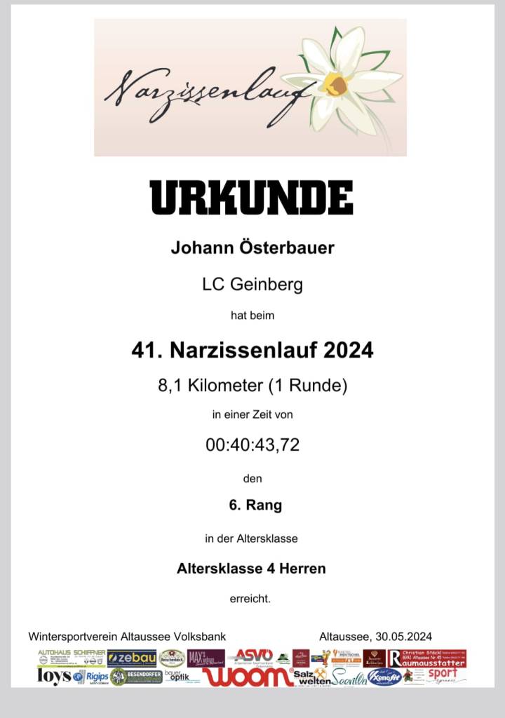 41. Narzissenlauf – Altaussee, 30.05.2024 31. Mai 202414. Juli 2025 Author von lcgeinbergVeröffentlicht in 2024 8,1 kmJohann Österbauer – 00:40:43, Altersklasse 4 Herren – 6. Platz Teilen mit: Klick, um auf Facebook zu teilen (Wird in neuem Fenster geöffnet) Facebook Klicken, um einem Freund einen Link per E-Mail zu senden (Wird in neuem Fenster geöffnet) E-Mail Ähnliche Beiträge