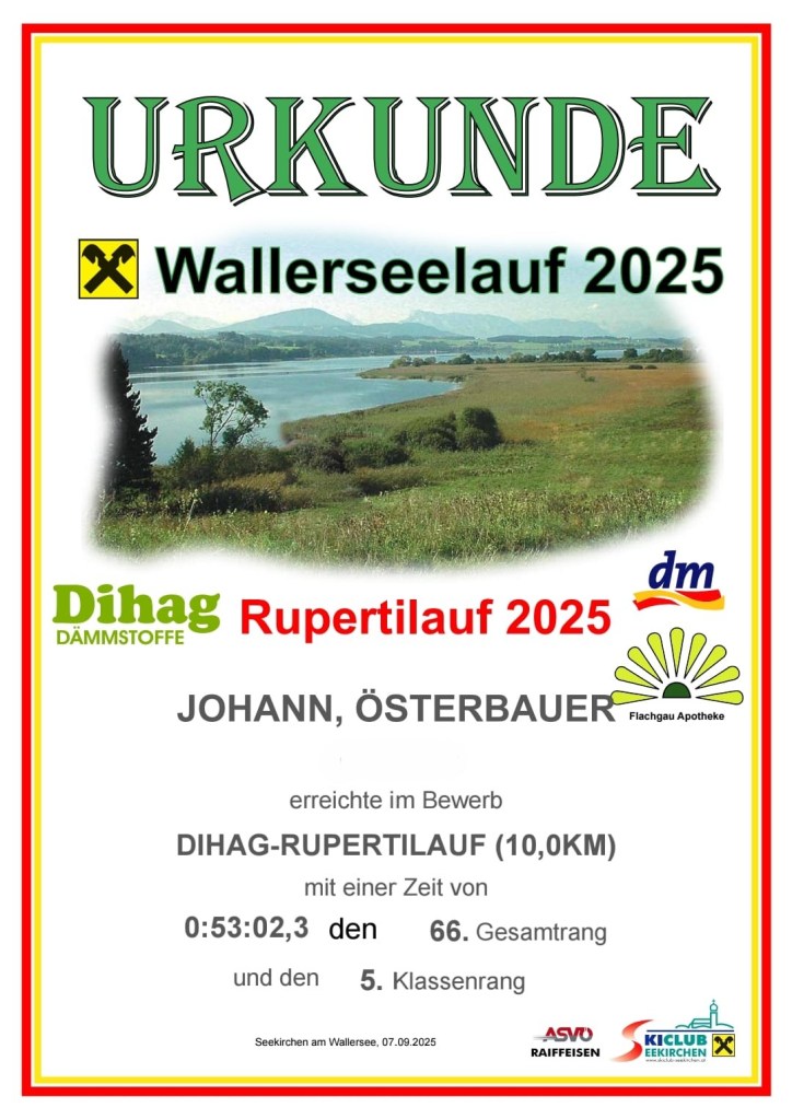 Beim 23. Rupertilauf in Seekirchen am Wallersee am vergangenen Samstag war unser Johann Österbauer am Start und lief die 10 km in einer Zeit von 53:02,3 Minuten. 🏃♂️👏
